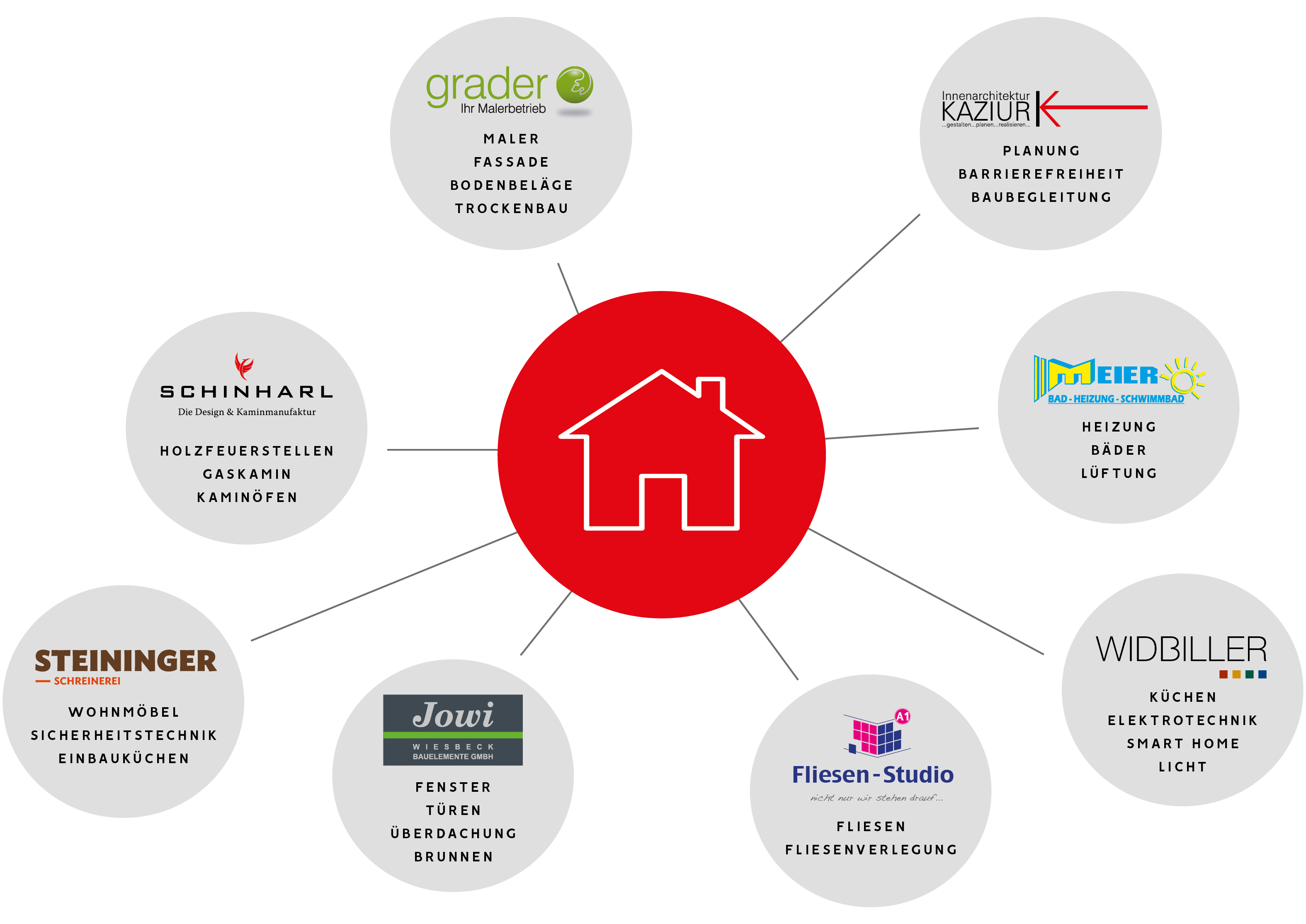 Sie wollen gute Beratung? Zuverlässige Handwerker? Betriebe, die Hand in Hand arbeiten, damit Sie beim Bau oder der Renovierung keine Zeit verlieren? Bei uns finden Sie Bäder, Böden, Dekorationen, Elektroinstallation und -geräte, Fenster, Fliesen, Heizungen, Innenarchitektur, Kamin- und Kachelöfen, Küchen, Maler, Natursteine, Paneele und Terrassendielen, Raumgestaltung, Smart Home, Schreinerei, Türen und vieles mehr. Lassen Sie sich von unserer Erfahrung inspirieren und setzen Sie von Anfang an auf ein perfektes Ergebnis.
